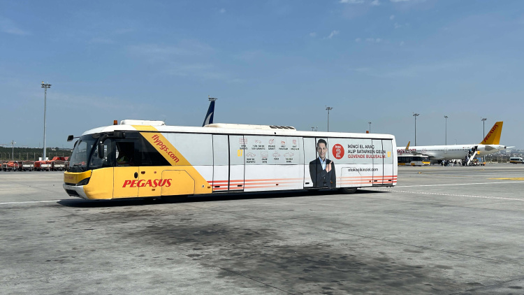 Pegasus apron otobüsleri, yolcuların terminalden uçağa geçişi sırasında markanızın göz alıcı bir şekilde yer almasını sağlar.